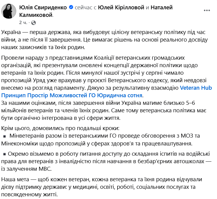 Об этом заявила премьер-министр Юлия Свириденко во время совещания с представительницами Коалиции ветеранских общественных организаций.