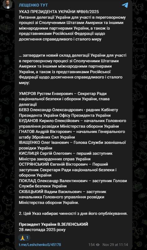 Встреча украинской делегации с американскими спецпредставитлями Стивеном Уиткоффом и Джаредом Кушнером состоится в воскресенье, она будет посвящена мирному плану.