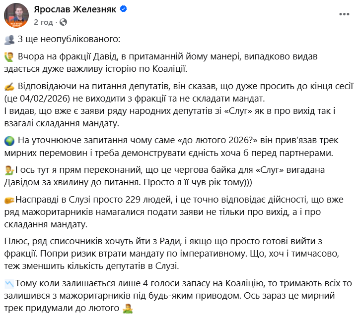 Железняк уверен, что Арахамия пытается избежать потери монобольшинства, в котором осталось 229 депутатов при минимуме в 226. Притом депутаты-списочники, желающие покинуть фракцию, готовы к тому, что придется покинуть и Раду, утверждает нардеп.