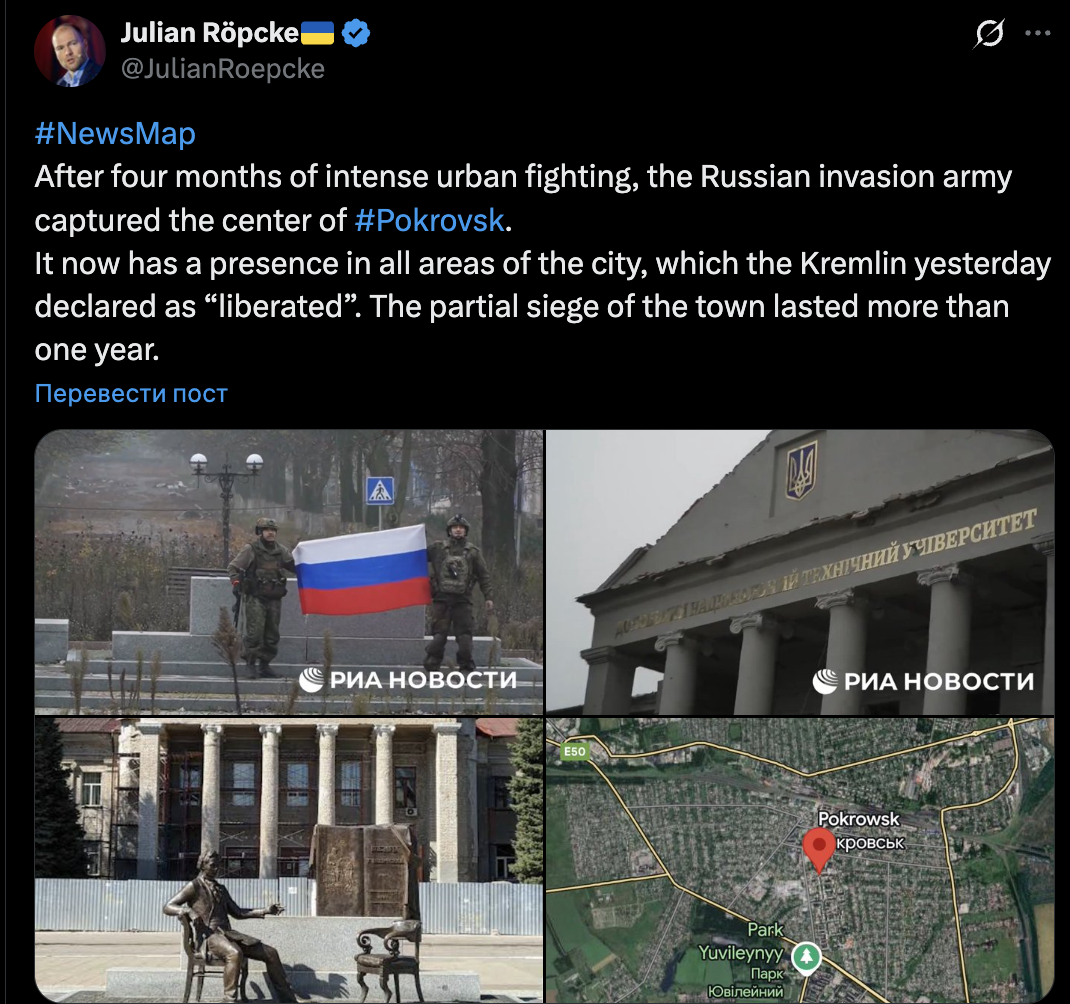 О том, что россияне взяли центр Покровска, пишет и немецкий военный обозреватель Юлиан Рёпке. Он также дает понять, что город потерян.