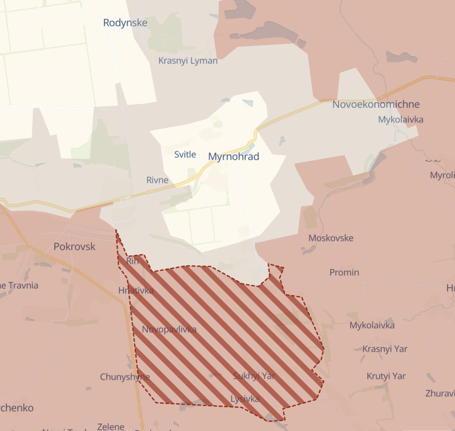 Также россияне продвинулись к югу от Мирнограда, что подтверждает недавнюю информацию СМИ о выходе украинских войск из Сухого Яра и Лысовки.