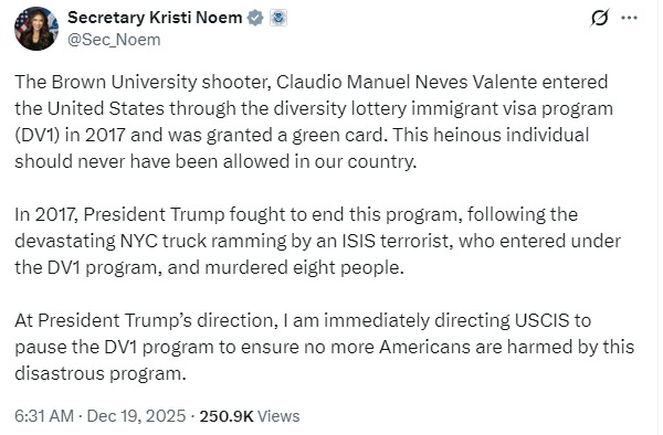 "Клаудио Мануэль Невес Валенте, стрелок из Брауновского университета, въехал в США в 2017 году по программе иммиграционных виз диверсификационной лотереи (DV1) и получил грин-карту. Этому гнусному человеку никогда не следовало разрешать въезд в нашу страну. В 2017 году президент Трамп боролся за прекращение действия этой программы после ужасающего инцидента в Нью-Йорке, когда террорист ИГИЛ, въехавший по программе DV1, протаранил грузовиком восемь человек. По указанию президента Трампа я немедленно поручаю USCIS приостановить программу DV1, чтобы гарантировать, что от этой катастрофической программы больше никто из американцев не пострадает", - сказано в публикации Ноэм.