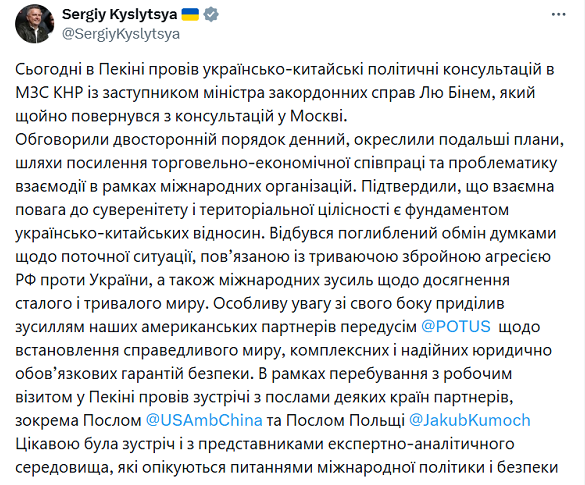 После этого на переговорах с Лю Бинем "состоялся углубленный обмен мнениями" о войне, а также "международных усилиях по достижению устойчивого и прочного мира". Также дипломаты они обсудили двусторонние вопросы отношений двух стран. По заявлению МИД Украины, Пекин и Киев "подтвердили, что взаимное уважение к суверенитету и территориальной целостности является фундаментом украинско-китайских отношений".