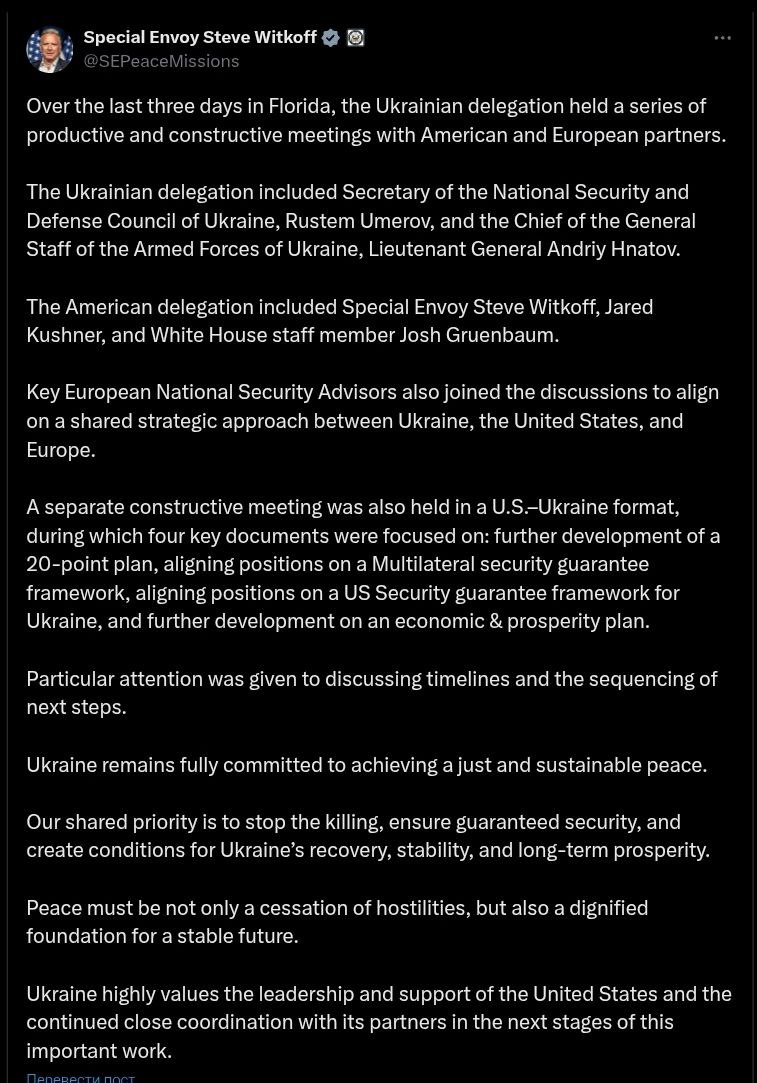 В свою очередь секретарь СНБО Рустем Умеров разместил в соцсетях тот же текст об итогах переговоров, что и Уиткофф.