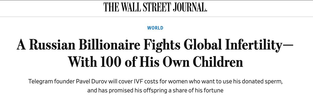 Основатель мессенджера Telegram Павел Дуров готов оплатить расходы на экстракорпоральное оплодотворение (ЭКО) для всех незамужних женщин моложе 38 лет, желающих использовать его донорскую сперму для оплодотворения, и обещает своим детям долю от своего состояния, которое оценивается в 17 миллионов долларов.