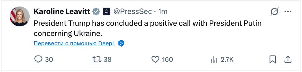 "Сегодня между российским и американским президентами состоялся очередной телефонный разговор. Дональд Трамп и присутствовавшие при этом разговоре его ключевые советники подробно, в деталях проинформировали об основных итогах вчерашних переговоров в Мар-а-Лаго с украинской делегацией.