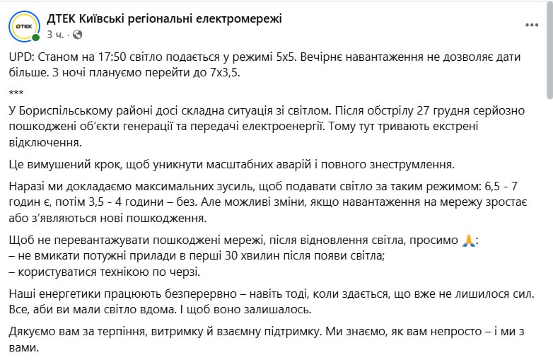 20.13 В Бориспольском районе Киевской области уже больше недели продолжают действовать экстренные отключения, сообщает ДТЭК.