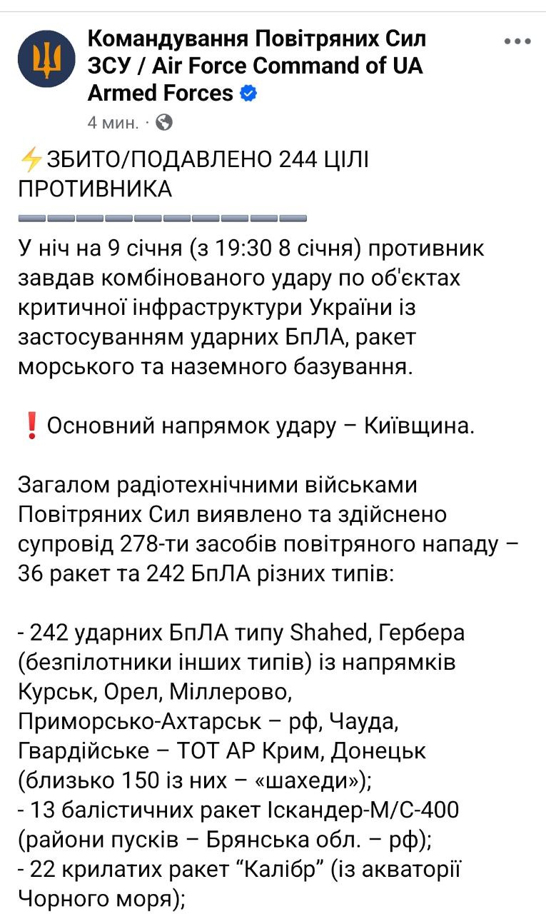 "В общей сложности за эту ночь было 242 дрона, только баллистических ракет и именно против объектов энергетики и гражданской инфраструктуры – 13, одна баллистическая ракета средней дальности "Орешник", а также 22 крылатые ракеты. Атака именно тогда, когда происходит значительное похолодание. Именно против обычной жизни обычных людей", - пишет президент.