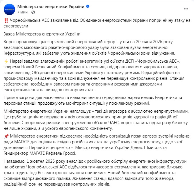 Вскоре после появления публикации МАГАТЭ Министерство энергетики Украины сообщило, что в ночь на 20 января в результате массированного ракетно-дронового удара были атакованы узлы энергетической инфраструктуры, обеспечивающие питание объектов Чернобыльской зоны отчуждения.