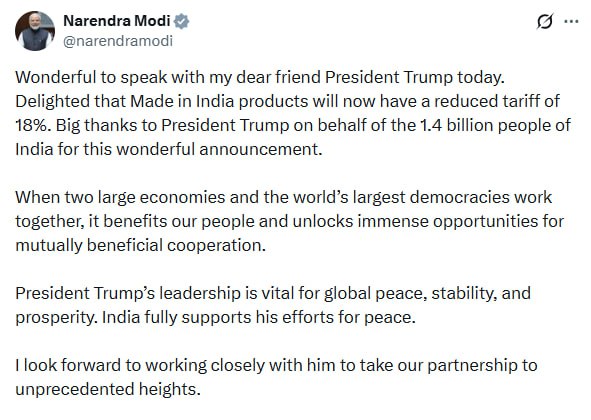 "Было замечательно сегодня поговорить с моим дорогим другом, президентом Трампом. Я рад, что на товары, произведенные в Индии, теперь будет действовать сниженная таможенная пошлина в размере 18%. Огромное спасибо президенту Трампу от имени 1,4 миллиарда жителей Индии за это замечательное объявление", – написал он.