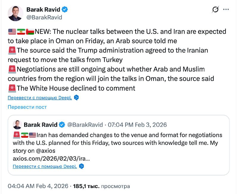 "Источник сообщил, что администрация Трампа согласилась с просьбой Ирана перенести переговоры из Турции. По словам источника, переговоры о том, присоединятся ли к встрече в Омане арабские и мусульманские страны региона, всё ещё продолжаются. Белый дом отказался от комментариев", - сказано в публикации.