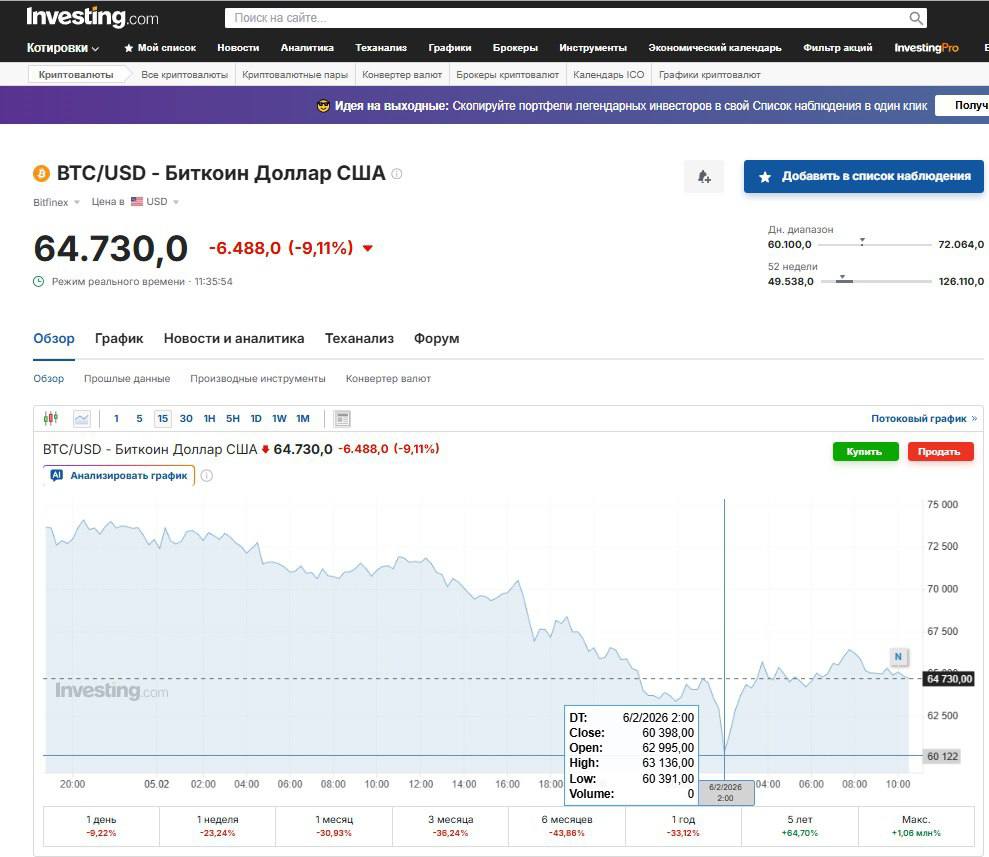 Вчера сброс биткоина привел к провалу его курса на 12% — до $64 тыс. за монету, а в ночь на сегодня курс рухнул вообще до $60,3 тыс. От пиковой цены в $125 тысяч в октябре 2025-го обвал оказался более чем двухкратным.
