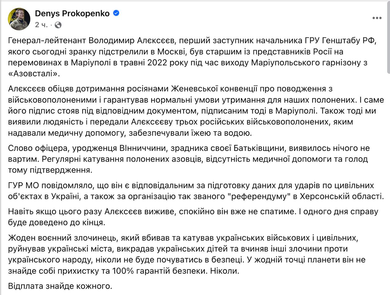 Командир "Азова" Денис Прокопенко (Редис) дает понять, что покушение на генерал-лейтенанта Министерства обороны РФ, первого заместителя начальника Главного разведывательного управления (ГРУ) Генерального штаба российских Вооружённых сил Владимира Алексеева было осуществлено Украиной.