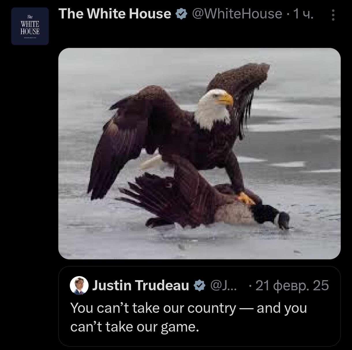 Так Белый дом ответил на пост бывшего премьер-министра Канады Джастина Трюдо, который после победы канадцев над американцами в финале Турнира четырех наций 2025 года написал: "Вам не отнять нашу страну - и не отнять нашу игру".