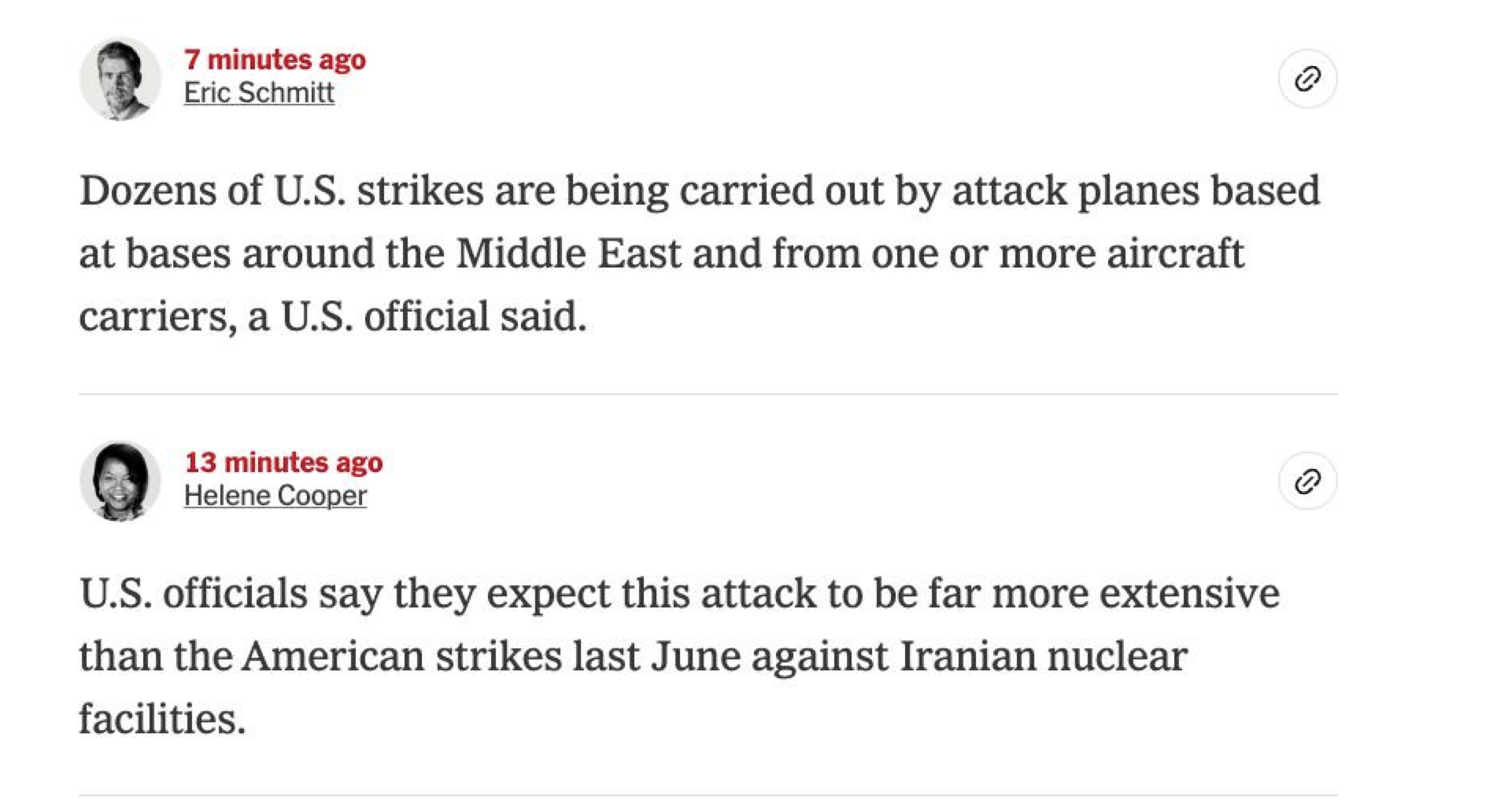 «Десятки американских ударов наносятся штурмовиками, базирующимися на базах по всему Ближнему Востоку, а также с одного или нескольких авианосцев, сообщил американский чиновник. Американские официальные лица заявляют, что эта атака будет гораздо масштабнее, чем американские удары по иранским ядерным объектам в июне прошлого года», - пишет газета.