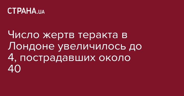 Количество погибших в результате вчерашнего теракта в Лондоне увеличилось до 4 человек, среди них 1 полицейский. Пострадавших - более 40 человек. Об этом сообщает Associated Press в Twitter.