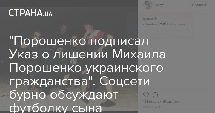 Так, журналист Левко Стек считает, что младшему Порошенко влетит от отца за эти фото: "Крайний справа - Михаил. Он - младший сын Петра Порошенко. Он - ученик престижного британского колледжа Concord. Он же - владелец стильной футболки Russia. Он же - получит от бати изрядной прохучанки за эту фотосессию."