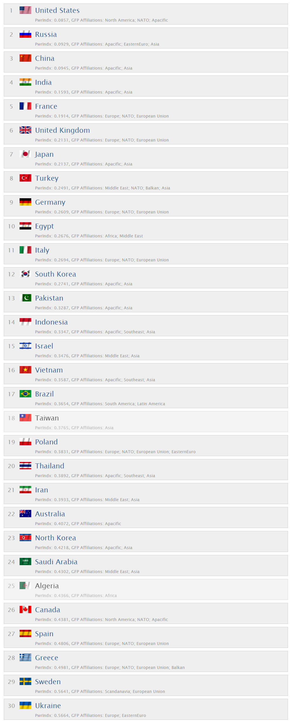 Страны, у которых есть ядерный арсенал, получали бонусные баллы. Также дополнительные баллы получали страны, входящие в НАТО.