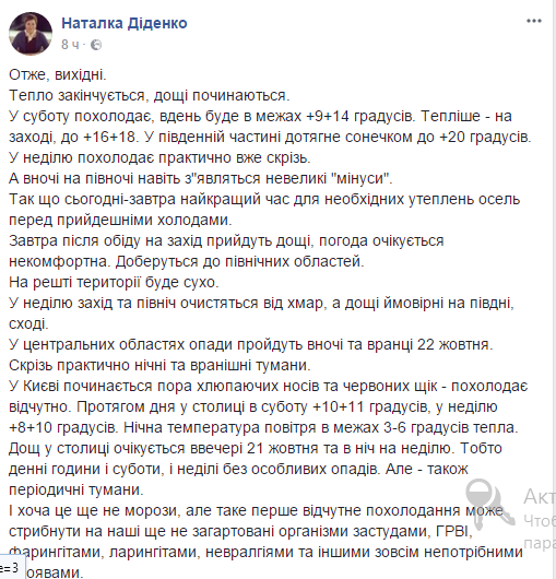 В Украине с субботы, 21 октября, похолодает, днем температура опустится до +9...+ 14 градусов. На западе Украины до +16...+18. В южной части до +20 градусов. Об этом на своей странице в социальной сети Facebook синоптик Наталья Диденко.