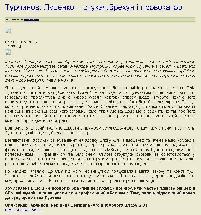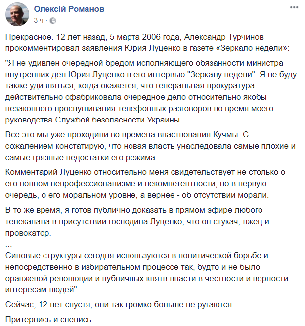 Прекрасное. 12 лет назад, 5 марта 2006 года, Александр Турчинов прокомментировал заявления Юрия Луценко в газете "Зеркало недели":