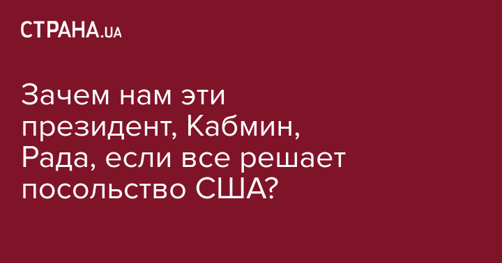 А на кой хрен нам все эти президент, Кабмин, Рада, прокуратура и антикоррупционные органы, на содержание которых мы миллиарды тратим, если всё в стране решает посольство США? Зачем этот театр, в котором "слуги не пойми кого" играют роли президента, министров и депутатов? Пусть уже США, а не народ, останутся единственным источником власти в Украине, а посол США, а не актёры на должностях, останется единственным институтом власти в Украине.