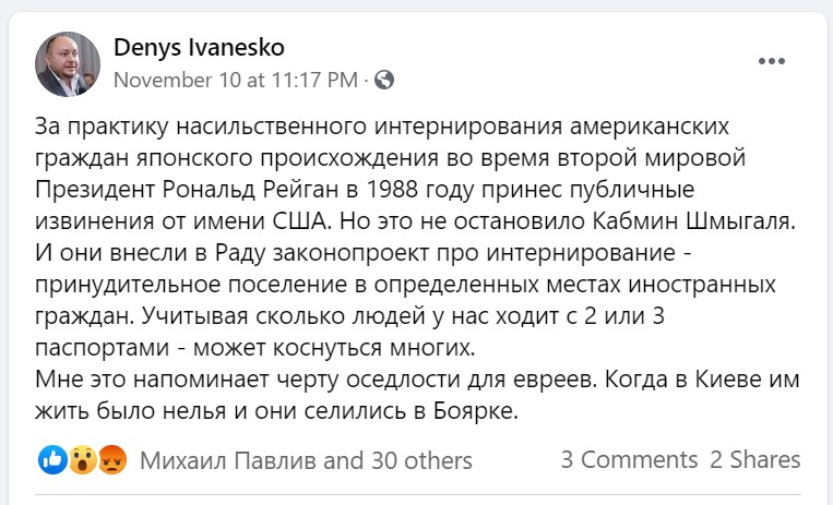 За практику насильственного интернирования американских граждан японского происхождения во время второй мировой Президент Рональд Рейган в 1988 году принес публичные извинения от имени США. Но это не остановило Кабмин Шмыгаля. И они внесли в Раду законопроект про интернирование - принудительное поселение в определенных местах иностранных граждан.