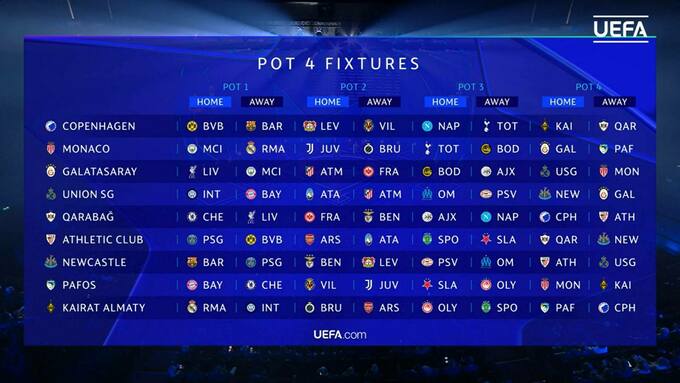 Соперники определены жеребьевкой по специальной компьютерной системе. Каждый клуб проведет по два матча с представителями каждой корзины – один дома и один на выезде.