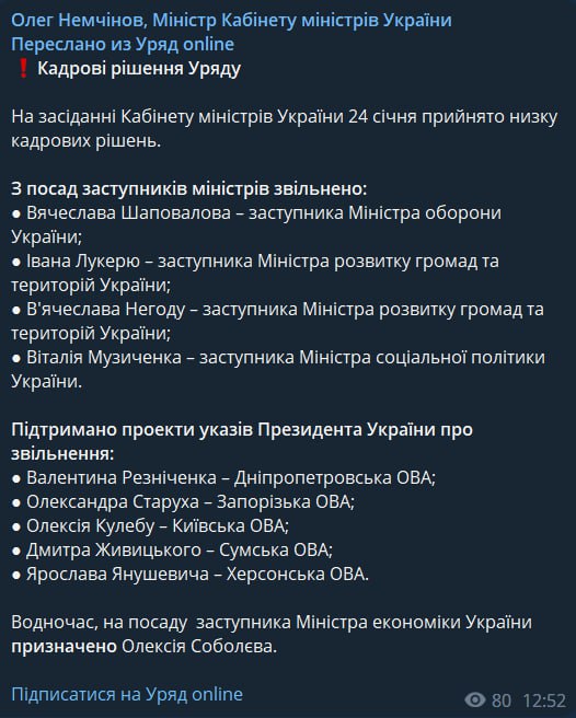 Кабмін на засіданні у вівторок, 24 січня, ухвалив низку кадрових рішень щодо звільнення заступників міністрів, а також голів ОВА.