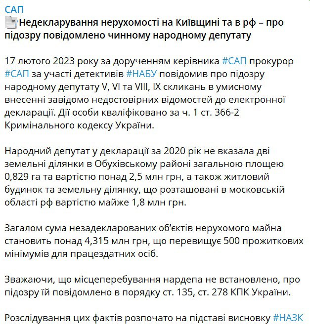 Прізвище депутата не повідомляється, але ЗМІ пишуть, що йдеться про Наталію Королевську, яка в декларації за 2020 рік не вказала дві земельні ділянки в Обухівському районі загальною площею 0,829 га та вартістю понад 2,5 млн грн, а також житловий будинок та земельну ділянку, розташовані в Московській області РФ вартістю майже 1,8 млн. грн.