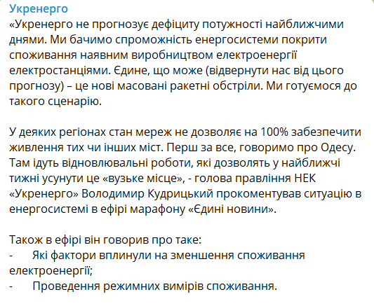 "Укренерго" не прогнозує дефіцит потужності найближчими днями. Ми бачимо здатність енергосистеми покрити споживання існуючим виробництвом електроенергії електростанціями. Єдине, що може відвернути нас від цього прогнозу – це нові масовані ракетні обстріли. Ми готуємось до такого сценарію", - сказав він.