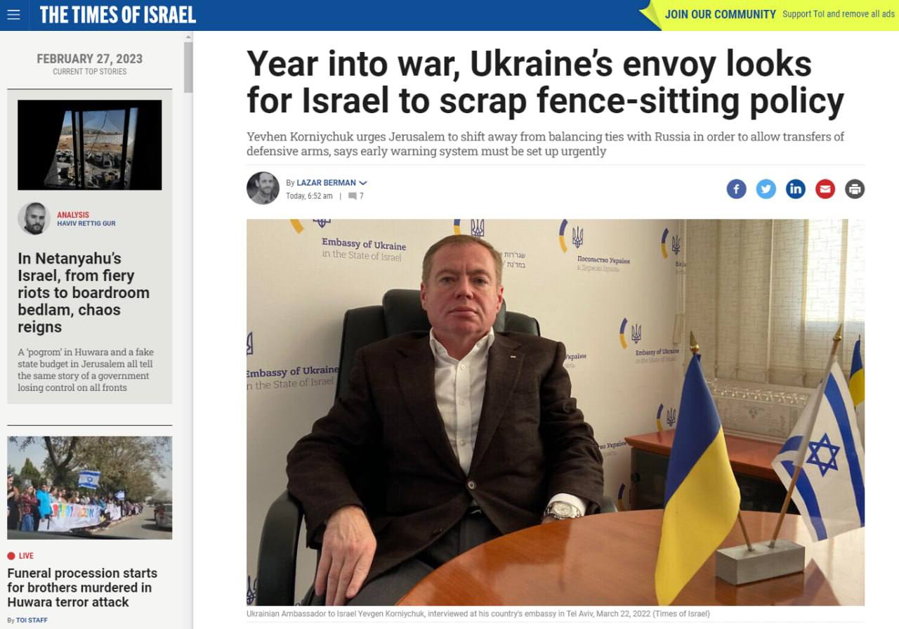 На цьому наголосив посол України в Ізраїлі Євген Корнійчук в інтерв'ю The Times of Israel.