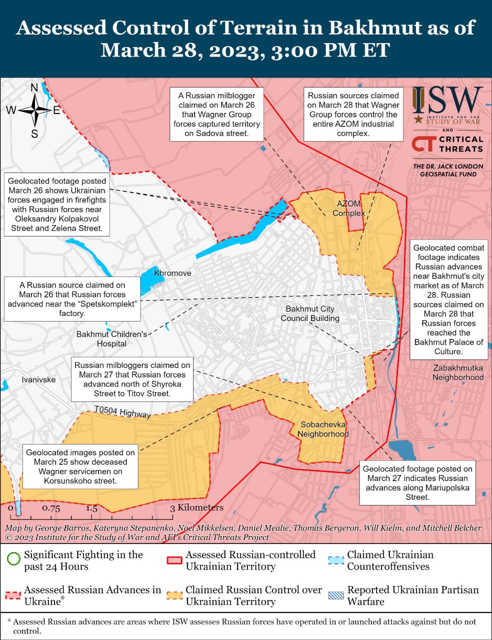 Також в "Інституті" підтверджують заяви російських блогерів про те, що "Вагнер" просунувся ближче до центру міста - взяв міський ринок і досяг Палацу культури: "Ці твердження правдоподібні з огляду на геолоковані візуальні докази просування Вагнера до центру міста, опубліковані 28 березня".