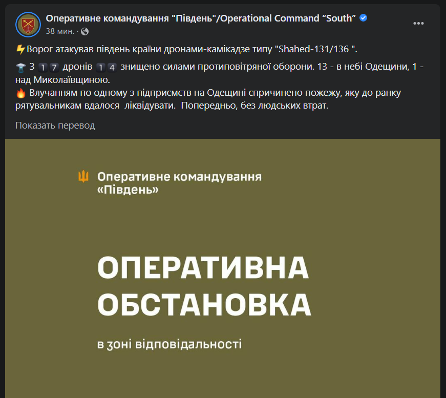 У ОК "Південь" уточнили, що минулої ночі українська ППО збила 13 дронів у небі Одеської області і ще один - над Миколаївською областю (загалом було збито 14 із 17 запущених росіянами дронів).