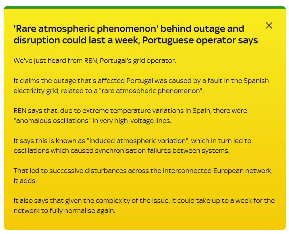У компанії стверджують, що через екстремальні перепади температури в Іспанії відбулися "аномальні коливання" у високовольтних лініях, що призвело до порушень у всій об'єднаній європейській мережі.