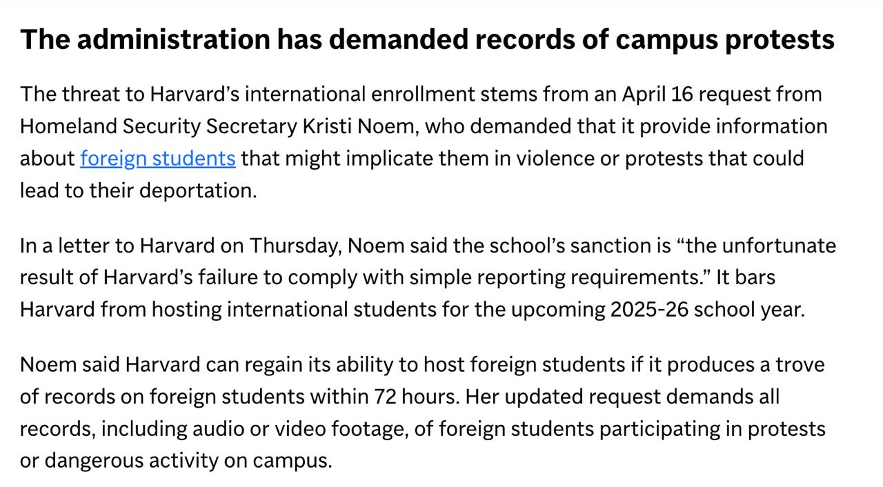 16 квітня міністр внутрішньої безпеки Крісті Ноем зажадала у Гарварда надати інформацію про іноземних студентів, які могли бути залучені до таких акцій, що проводилися на території університету.