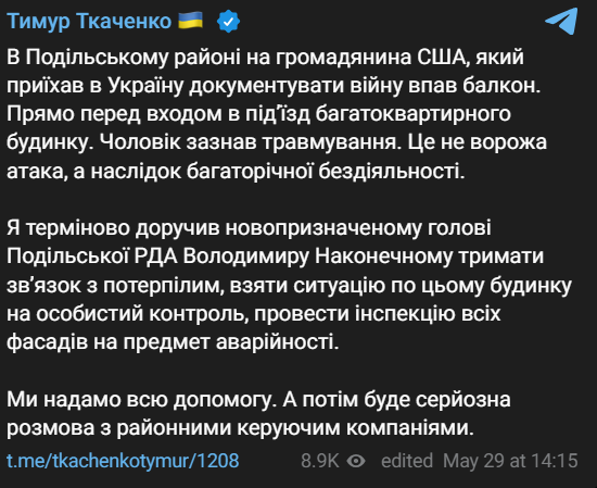 "У Подільському районі на громадянина США, який приїхав до України документувати війну, впав балкон. Прямо перед входом у під'їзд багатоквартирного будинку. Чоловік отримав травмування. Це не ворожа атака, а наслідок багаторічної бездіяльності", - написав він.