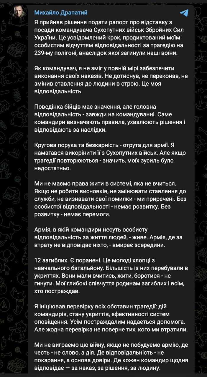 "Кругова порука і безкарність – отрута для армії. Я намагався викорінити її із Сухопутних військ. Ми не маємо права жити в системі, яка не навчається. Армія, в якій командири несуть особисту відповідальність за життя людей, – живе. Армія, де за втрату не відповідає ніхто, – помирає зсередини", - заявив вiн.