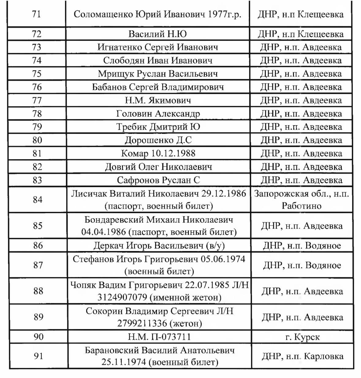 Чиновник виклав прізвища 121 військового, які загинули, як випливає з таблиць, на різних ділянках фронту від Курської до Донецької області. Судячи з усього, тіла були зібрані в різні періоди, оскільки в ньому значаться загиблі, зокрема, з Авдіївки, де основні бої точилися в 2023-2024 роках.