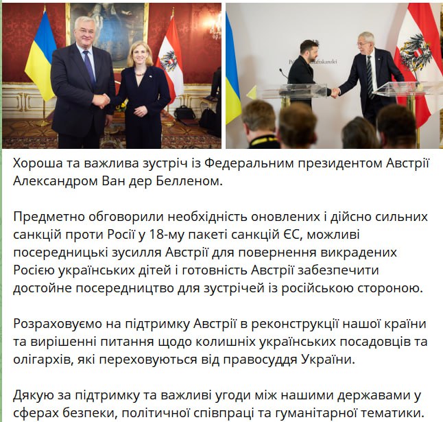 "Розраховуємо на підтримку Австрії у реконструкції нашої країни та вирішенні питання про колишніх українських чиновників та олігархів, які ховаються від правосуддя України", – написав президент України.