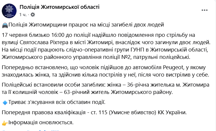 "17 червня близько 16:00 до поліції надійшло повідомлення про стрілянину на вулиці Святослава Ріхтера у місті Житомир, внаслідок чого загинуло двоє людей. На місці події працюють слідчо-оперативні групи ГУНП у Житомирській області, Житомирського районного управління поліції №2, патрульні поліцейські.