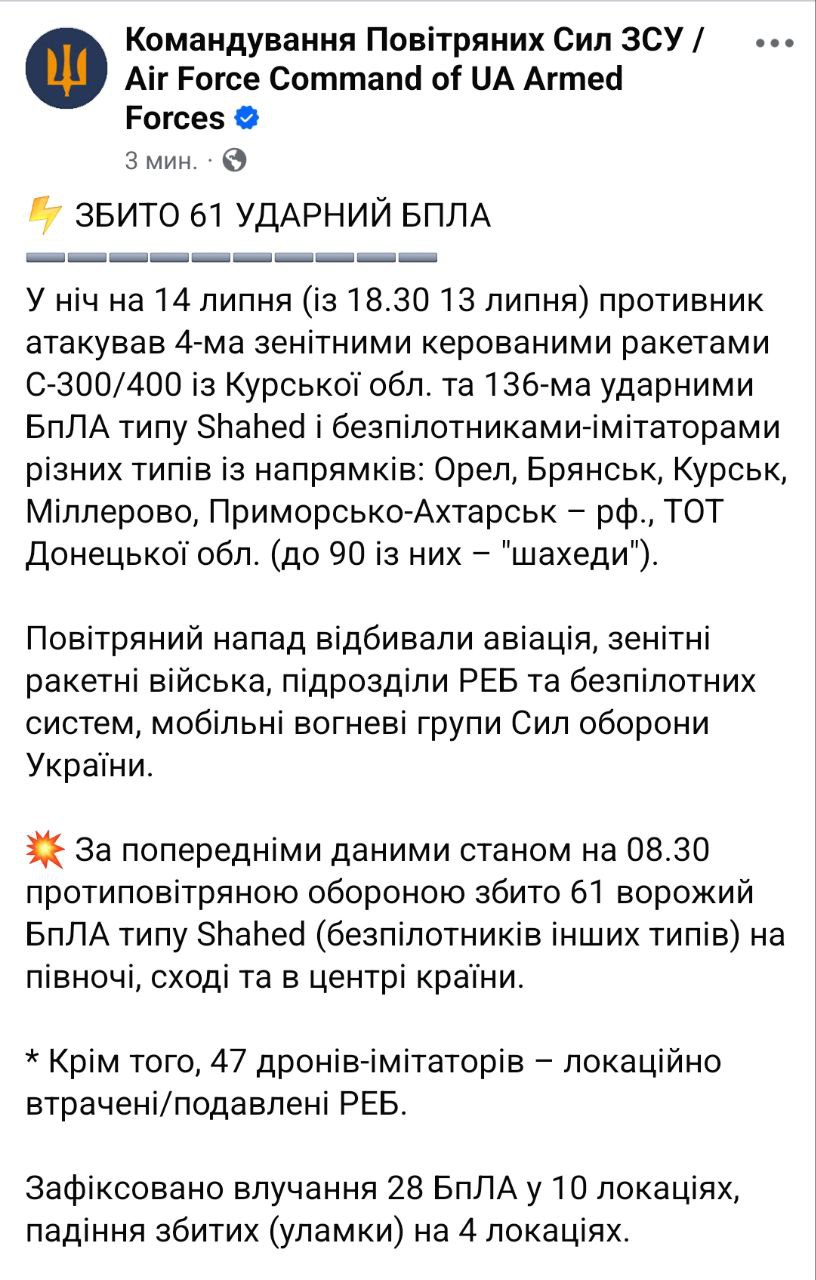 Збито 61 Shahed, ще 47 імітаторів було втрачено або придушено засобами РЕБ.