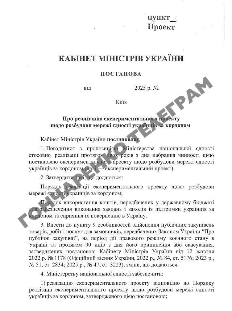 Метою проекту є єднання українців за кордоном. Згідно з ухвалою, експериментальний проект розрахований на два роки.