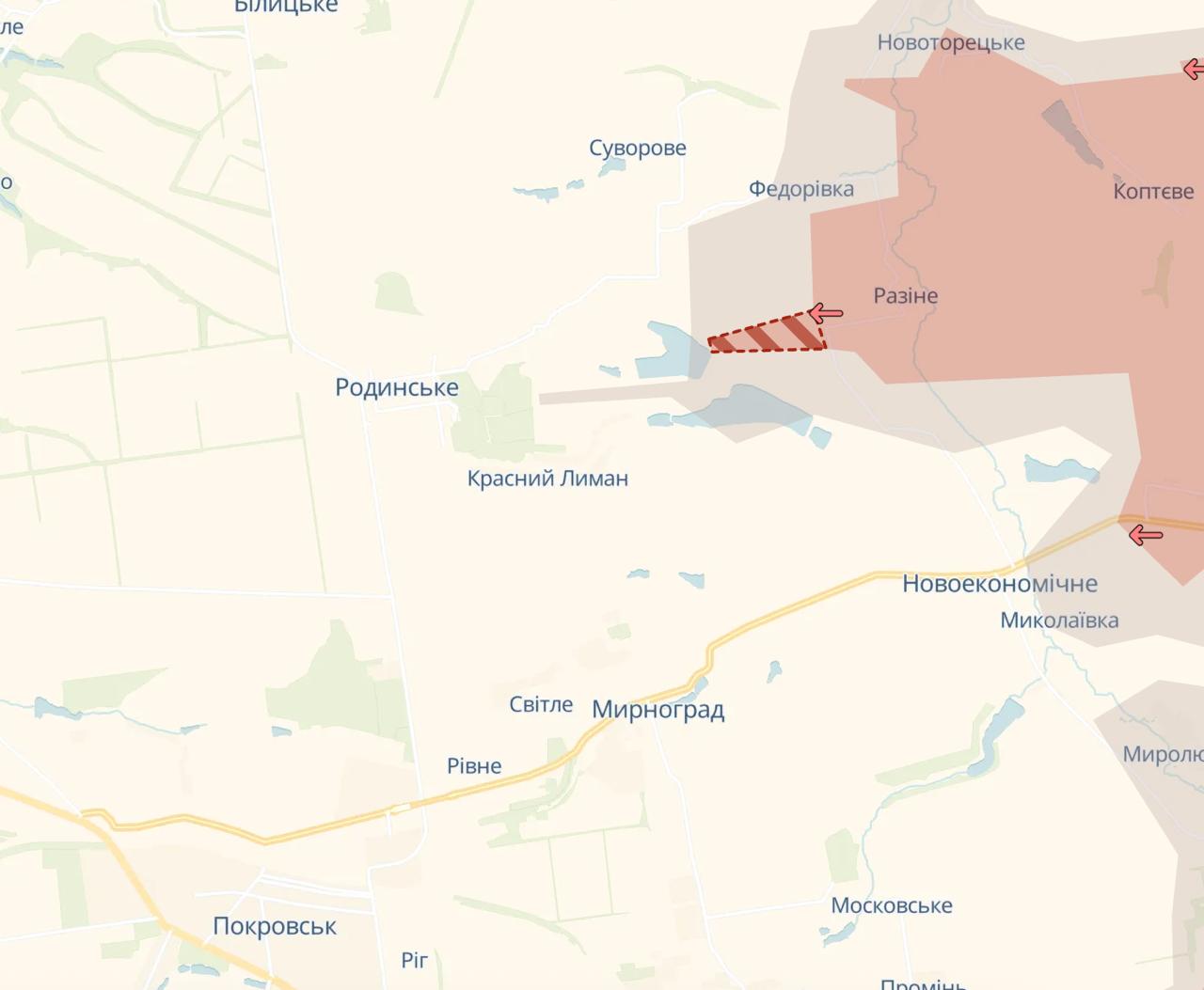 8.24 Росіяни знову просунулися на північ від Мирнограда, з боку Разіно, де сіра зона підійшла до Родинського міста.