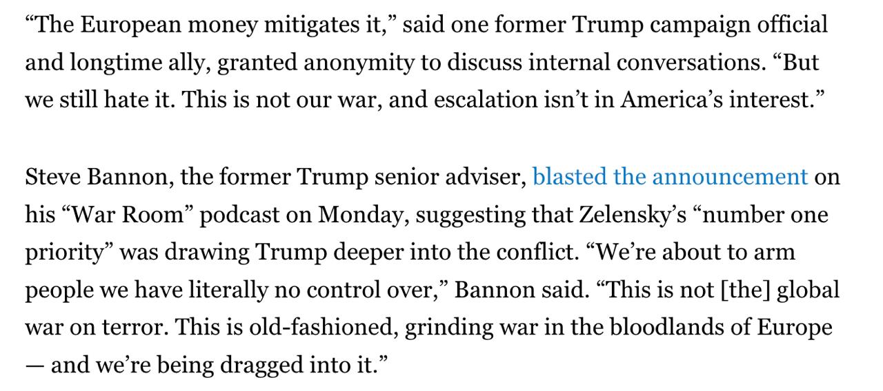 "Європейські гроші пом'якшують це. Але ми все ще ненавидимо це. Це не наша війна, і ескалація не на користь Америки", - сказав один із колишніх співробітників передвиборного штабу Трампа, які підтримують MAGA.