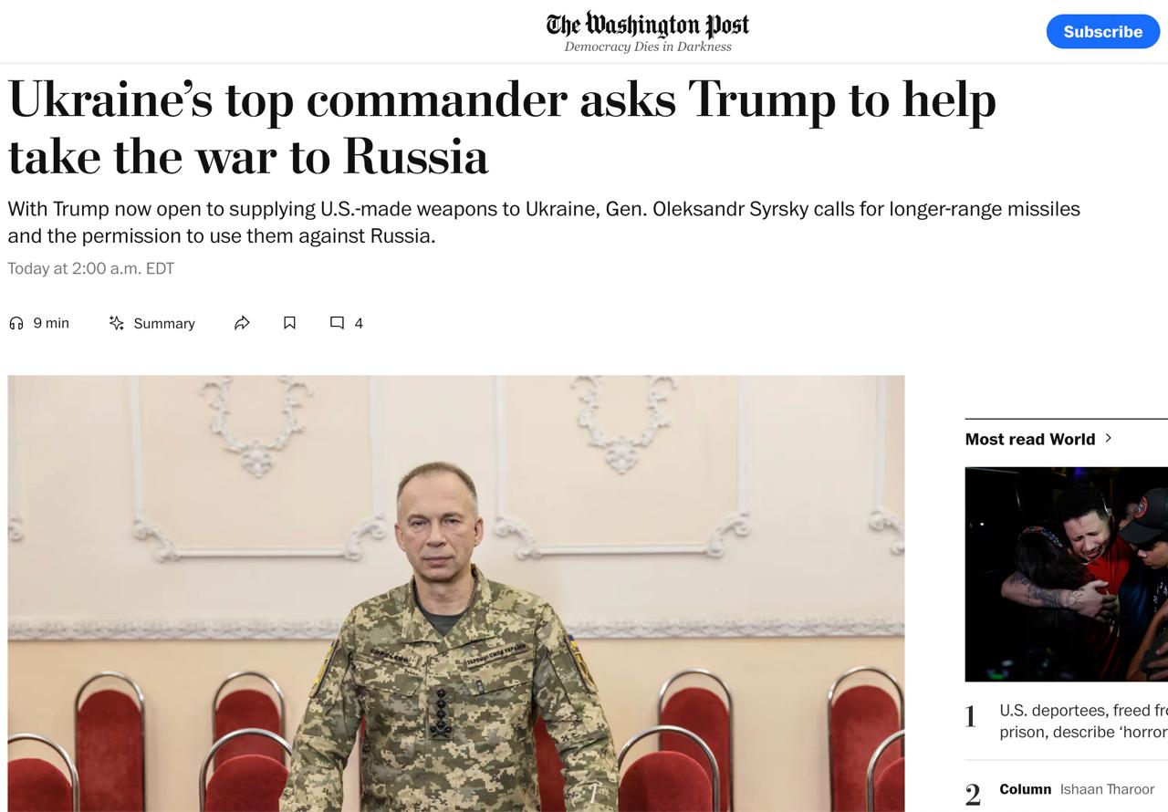 При цьому Сирський також просить президента США Дональда Трампа дати далекобійні ракети та зняти обмеження на них, щоби перенести війну в глибину території РФ.