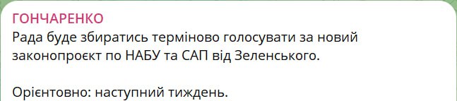 Тим часом нардеп із "Європейської солідарності" Олексій Гончаренко написав у своєму телеграм-каналі, що парламент збереться, щоб терміново голосувати за новий законопроект про НАБУ та САП від Зеленського. Орієнтовно це станеться наступного тижня.