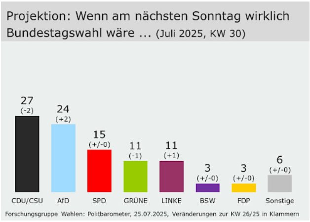 Згідно з опитуванням, з кінця червня "Альтернатива для Німеччини" набрала два процентні пункти і з результатом у 24% опинилася на другому місці в рейтингу політичних партій Німеччини. Це її найкращий результат із квітня.