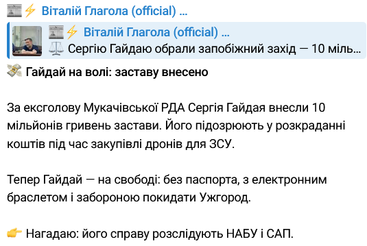 "Тепер Гайдай на волі: без паспорта, з електронним браслетом та забороною залишати Ужгород", - написав журналіст.