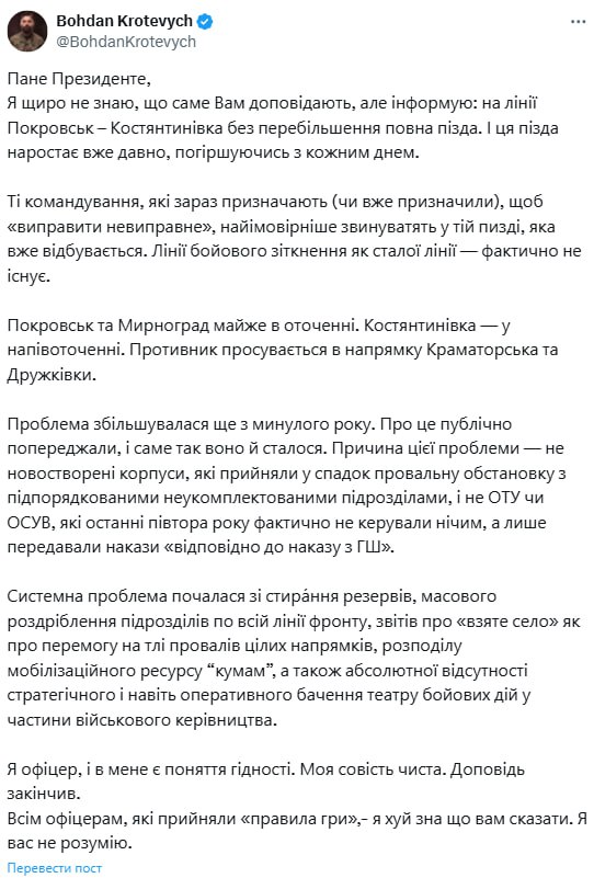 "Пан президент, я щиро не знаю, що саме вам доповідають, але інформую: на лінії Покровськ – Костянтинівка без перебільшення повна п@@30. І ця п@@30 наростає вже давно, погіршуючи з кожним днем", - заявив Кротевич.