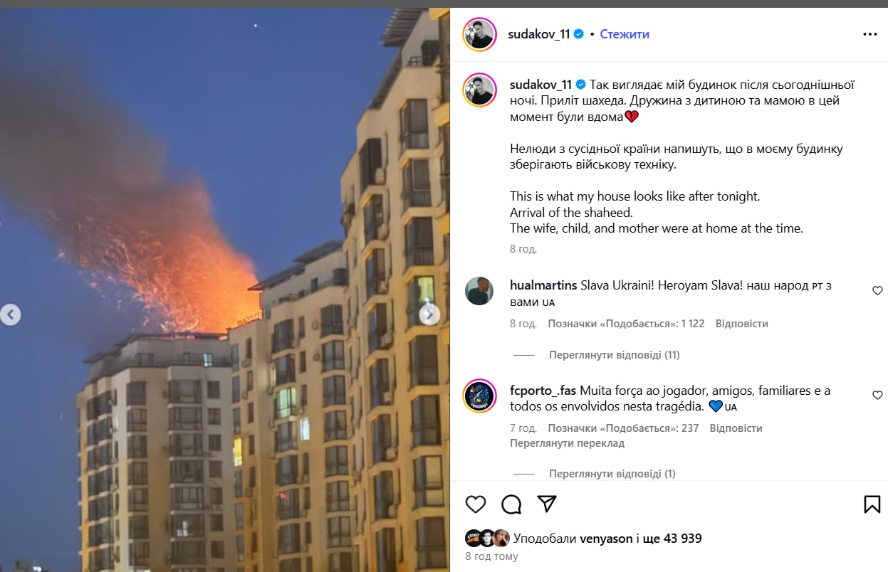 Під час атаки російських безпілотників на Київ, що сталася в ніч проти неділі, 7 вересня, було пошкоджено будинок півзахисника збірної України Георгія Судакова.